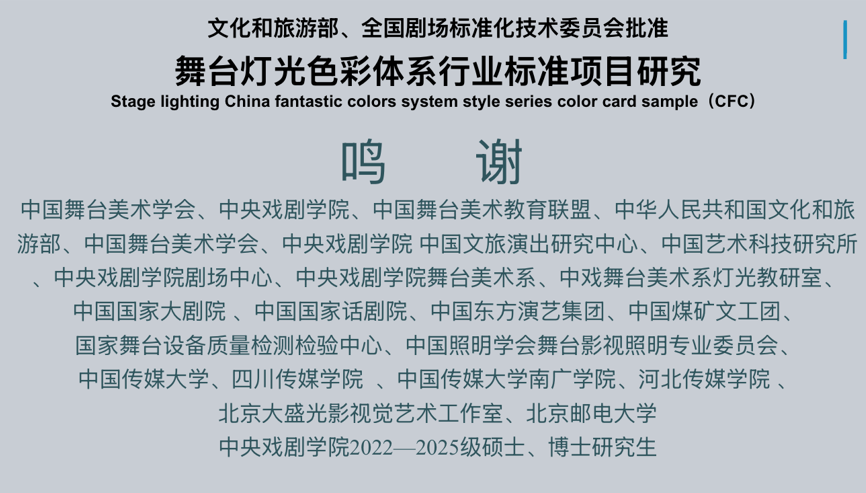答:目前招标文件对色彩要求不多,未来我们希望把中国《舞台灯光色彩体系》风采系列逐步升级,并服务于国家和省市重大演出的政府采购,从长远看,CFC中国风采系列色彩有助于提升舞台影视演出艺术水平并有助于高品质、高质量发展。