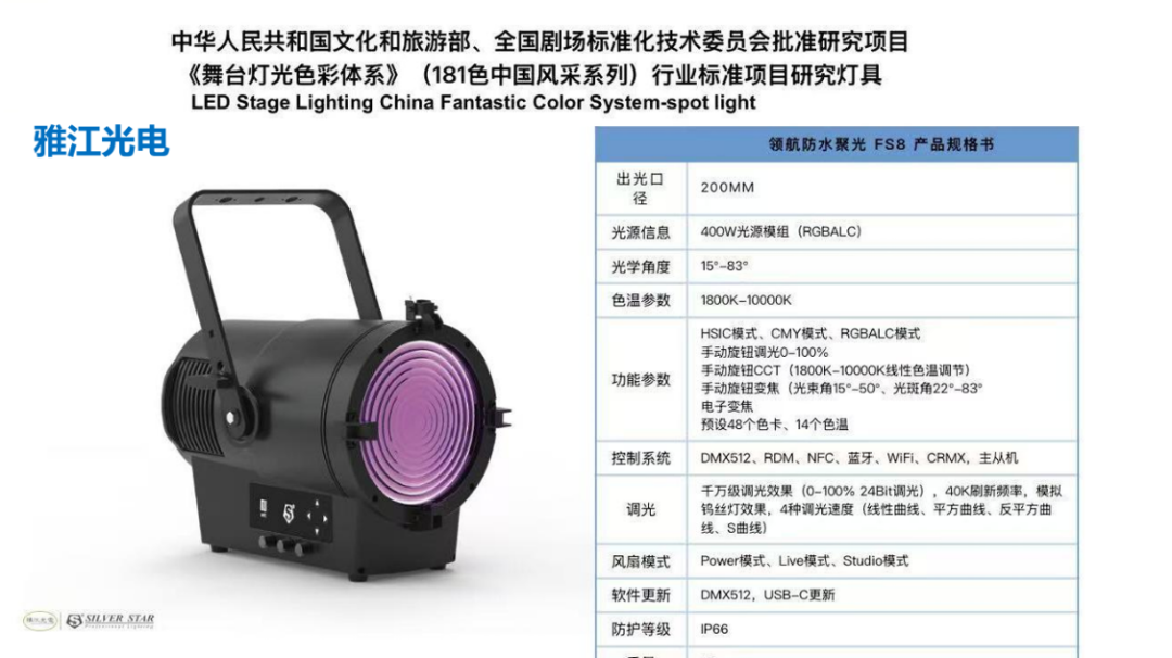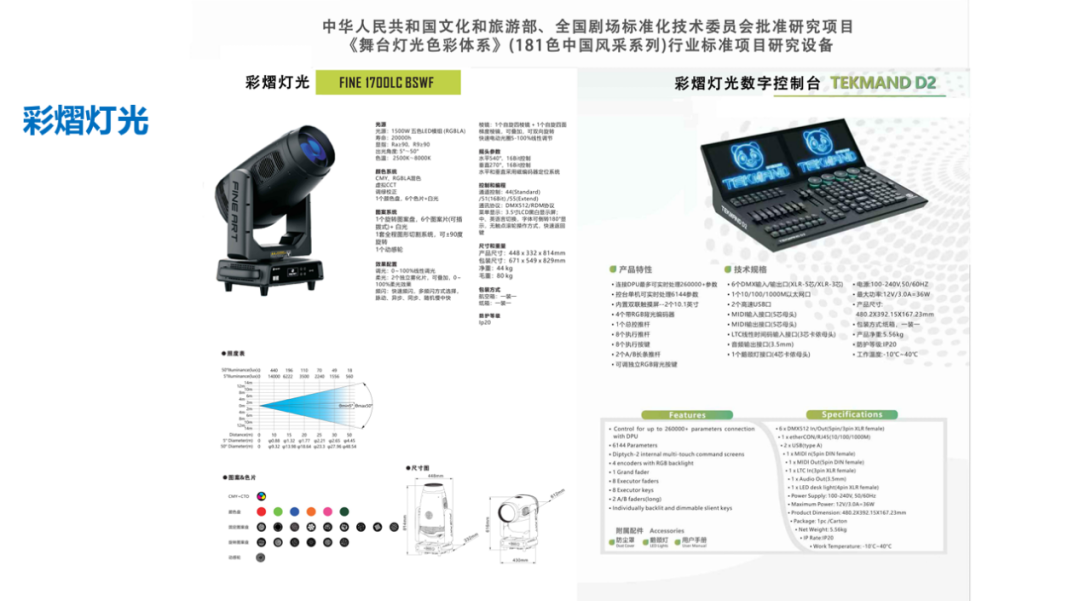 研讨会环节中,参编企业代表响应《舞台灯光色彩体系》标准研究并带来了为中国风采系列研发制造的样灯试验产品,以满足数字舞台影视灯具及调光控制设备与行业标准实现的需要,并对演示灯具设备进行了性能特点的介绍及相关参数的技术说明。