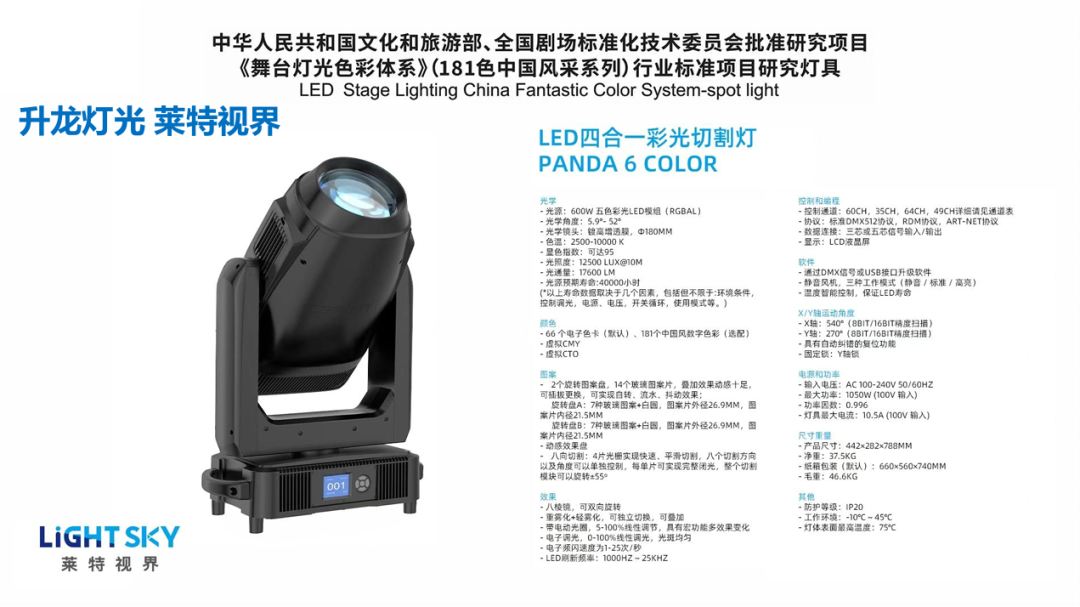 升龙灯光加强了灯具研发的力度,认为调光曲线是精准控制灯具驱动电流输出、调控亮度与参与混光和混色的关键,以实现灯具输出各种颜色配比通道值的准确度,校正与实际灯具光输出色彩的一致性,并带来了高功率多色切割灯电脑灯样机供现场演示与验证。并指出舞台影视科技研发的技术人员为数字中国《舞台灯光色彩体系》标准规范的实施付出的努力和辛劳,其目的是造福于舞台影视灯光艺术的未来发展。