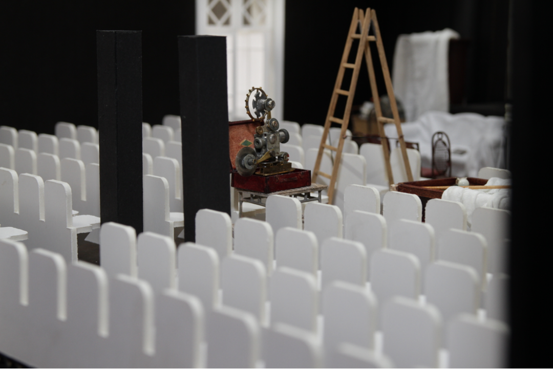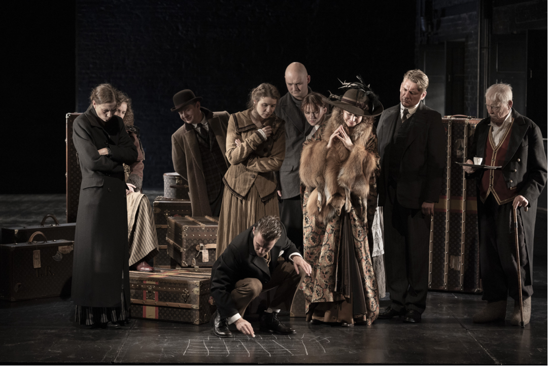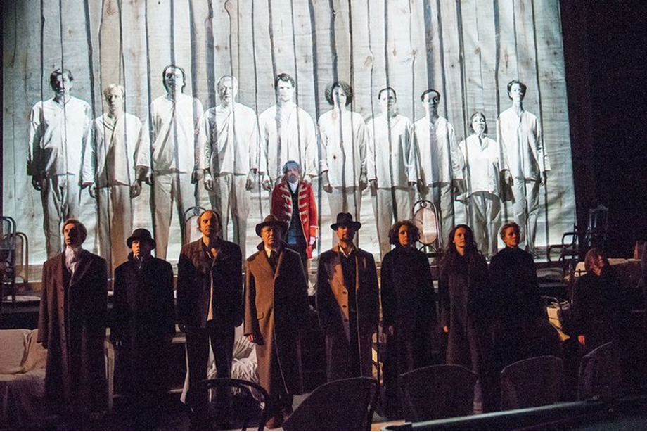 在圣彼得堡小剧院《樱桃园》的当代诠释中,亚历山大用“防尘罩”覆盖了家具、吊灯,占用部分观众席架设了梯子,放置台球桌。从而模糊了舞台与观众厅的界限,将戏剧空间拓展为记忆与现实的交汇场域。开场时运用放映设备投射契诃夫故居的回忆影像,将拉涅夫斯卡娅的往昔时光直接植入当下情境,形成情感上的强烈对照。在结尾处,多金导演把演员穿着囚服的影像直接对应地投在了背景木板前面的幕布上,以投影画面将贵族命运与1917年革命直接勾连,使契诃夫在剧本第二幕中所描写的舞台之外传来的,像琴弦断裂和忧伤垂死的声音,作为一种明确的警示和历史解读。