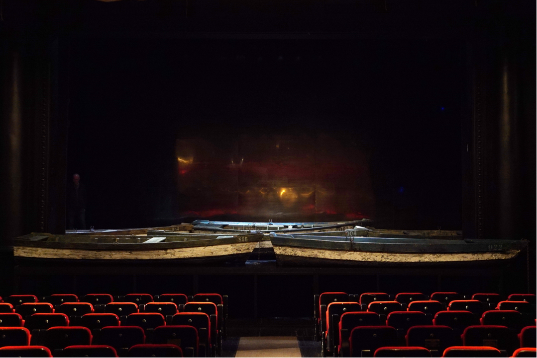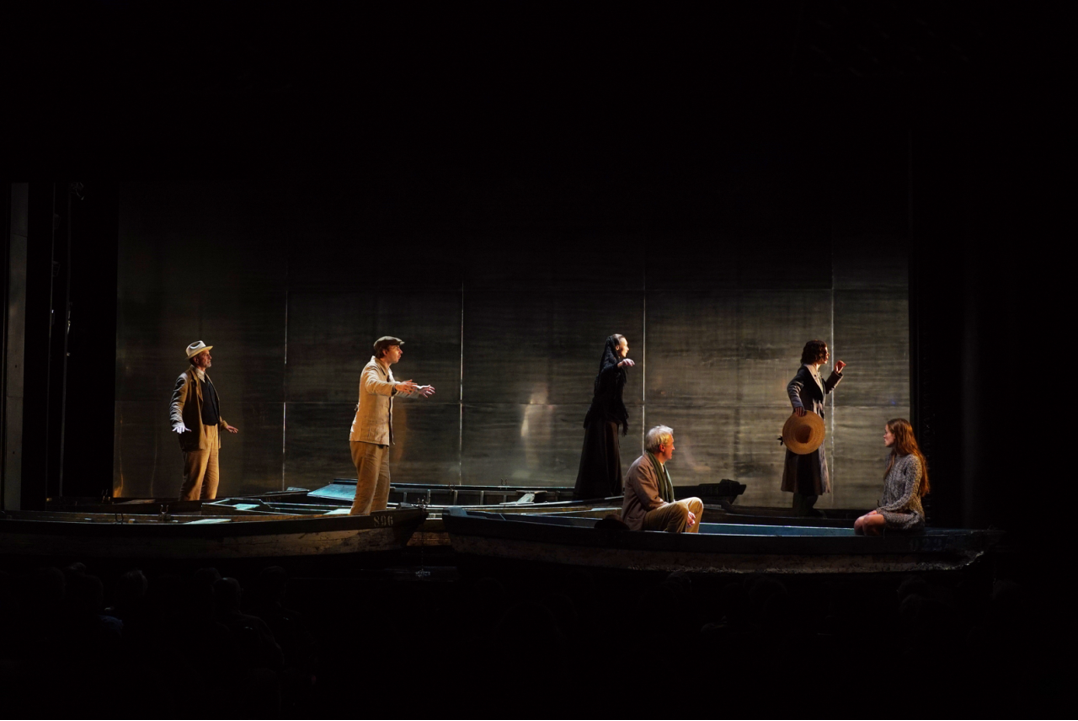 在圣彼得堡小剧院2022年演出的《海鸥》中,亚历山大·鲍罗夫斯基《海鸥》的舞台设计主体仅仅是布满舞台的七条小船,金属板背景像湖水闪烁。剧中的人物出场后,分别坐在各自的小船上。契诃夫剧本中著名的缺乏沟通的隐喻,立即在空间和视觉上体现出来。接下来演员的表演,由于脚下没有坚实的地面,他们总是在晃动、危险和不稳定中,就像一切的命运、人际关系和前途。