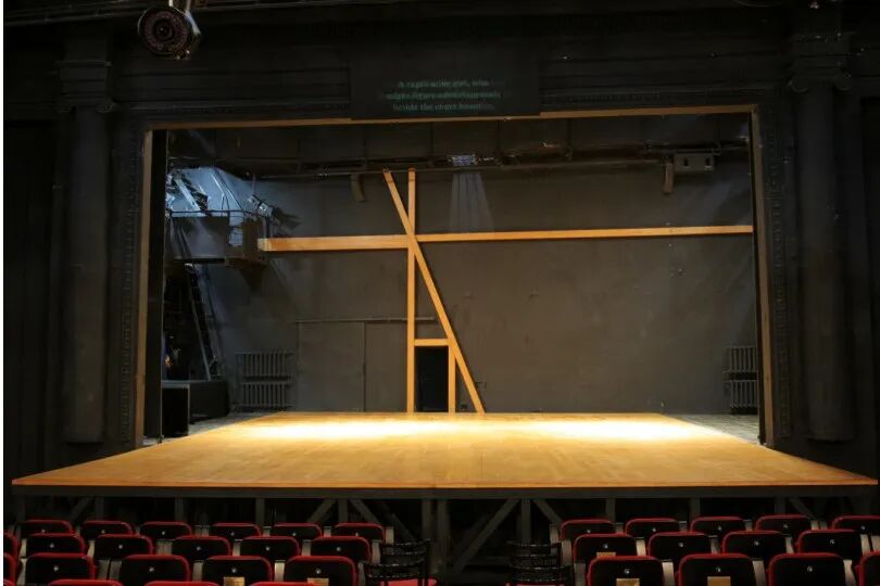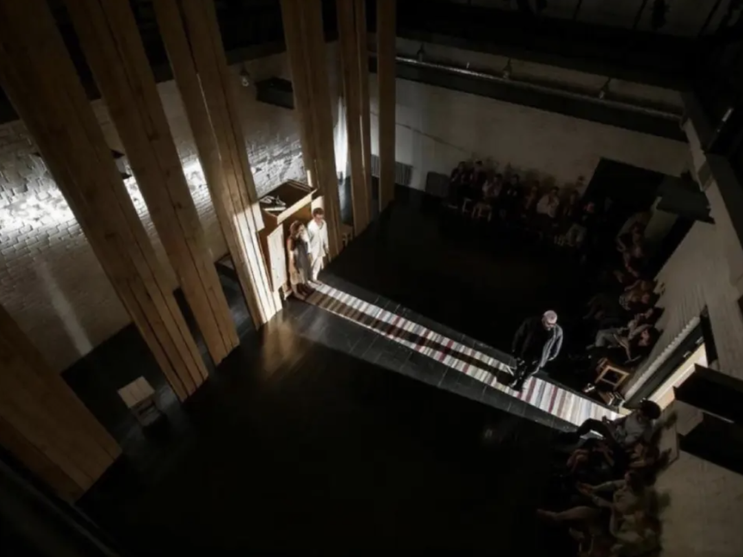 亚历山大一直将其空间理念贯彻于剧院的建构之中。他与导演珍诺瓦奇长期合作的莫斯科戏剧艺术工作室,由斯坦尼斯拉夫斯基家族金线工厂内的小剧院改造而成,强调了剧场空间的整体性与公平性,主张前台观众区与后台工作区域应具备同等的建筑品质与人性关怀。而在其中仅能容纳36人的实验小剧场演出的《波图丹河》中,他通过编号木板围合演出空间、强制收走手机等方式,构建了高度聚焦且具有仪式感的观演关系,强化戏剧的沉浸性与纯粹性。特别是,装修时留下的砖墙上延展的弯曲沟痕,被亚历山大·鲍罗夫斯基直接利用,转换成了点题的波图丹河。灯光使这条河床更加醒目——干燥、粗粝,暗示了作者安德烈·普拉托诺夫 (Andrey Platonov) 所归结的,精神之爱与肉体之爱之间的残忍、可怜的力量。