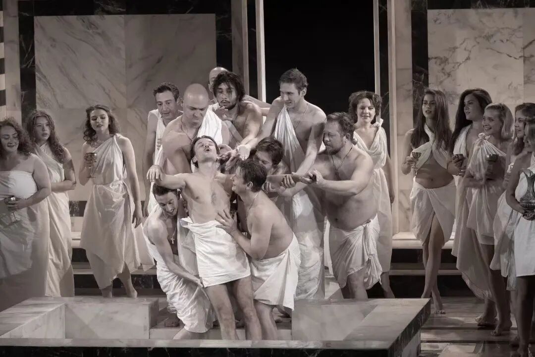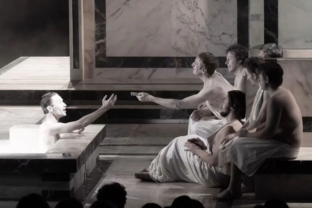 在《钦差大臣》的构思阶段,亚历山大基于对权力空间的观察,舞台中央设置了一座罗马式古典大理石质感的浴池。将场景设定为官员们频繁进出浴室。无论古代人和现代人到浴室中都是一样的一丝不挂,把所有人的内心袒露展示出来。无论文明发展到什么程度上,脱了衣服就会看到本质。这也是对俄罗斯政权运行的讽刺性、揭露性的东西。开场时,官员们逐一脱衣入池,通过这一富有象征意味的戏谑场面设定,直观揭示出权力与公共空间、私人空间的复杂交织,以及权力从古至今未曾变化的本质。同时,亚历山大对大理石效果的追求,源于罗马时期大理石所体现出的经典感,也象征着这种腐败是永远不变、不会消失的,一直伴随着人性的阴暗面。