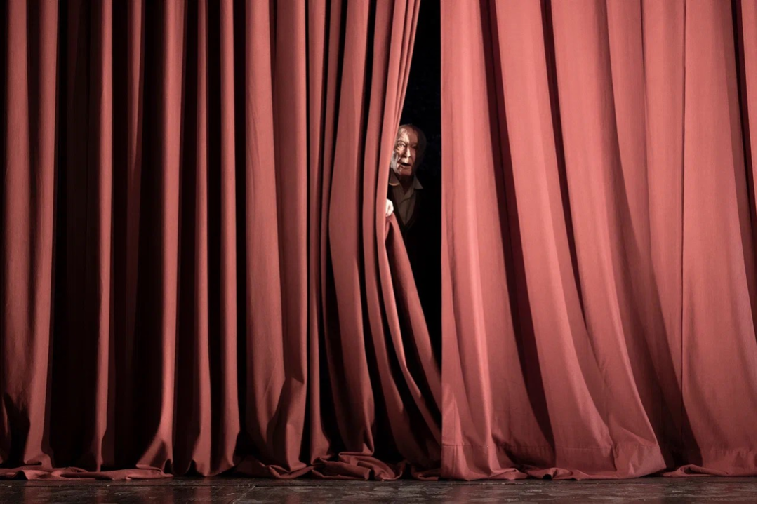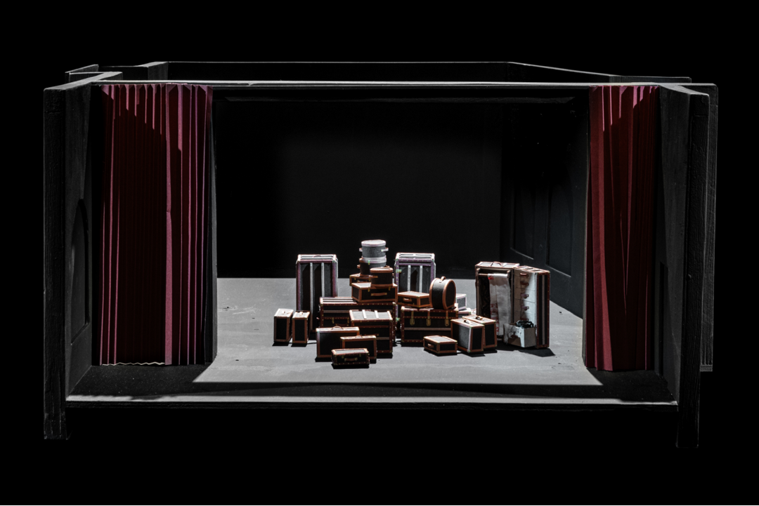 在与导演珍诺瓦奇的长期合作中,他推动戏剧语言从台词中心向身体与情绪表达的转向,在 2024年根据《樱桃园》改编排演的《契诃夫·樱桃园·无语》中,亚历山大·鲍罗夫斯基将通常敞开的莫斯科戏剧艺术工作室剧场的舞台,处理成开场时反常地合着大幕。红色大幕边的奏乐声停下来后,老仆人费尔斯先是撩开幕往外窥看,接着走出来用刷子擦拭大幕,最后他把大幕完全打开时,却是一个完全空荡荡的舞台。随着欢快而喧闹的队伍穿过观众席走上舞台,十几个手提箱、盒子、大箱子也被人搬运上台,既对应主人公长途旅程后归来,也成为接下来的演出布景或支点。结尾时,同样的搬运者会把所有这些东西匆匆搬走,就好像把它们永远从主人手中夺去一样。该剧摒弃传统台词,通过极简的舞台语汇——空无一物的舞台、箱子与行李构成的象征系统、表演区外的展示区——构建出契诃夫文本中失落与等待的情感场域。舞台以大幕启闭为叙事框架,仆人费尔斯成为空间的守护者与记忆的维系者,而剧场前厅设置的“开发区建筑规划沙盘”,将戏剧情境延伸至现实,吸引观众像购置房产的业主一样,饶有兴趣地参与其中。