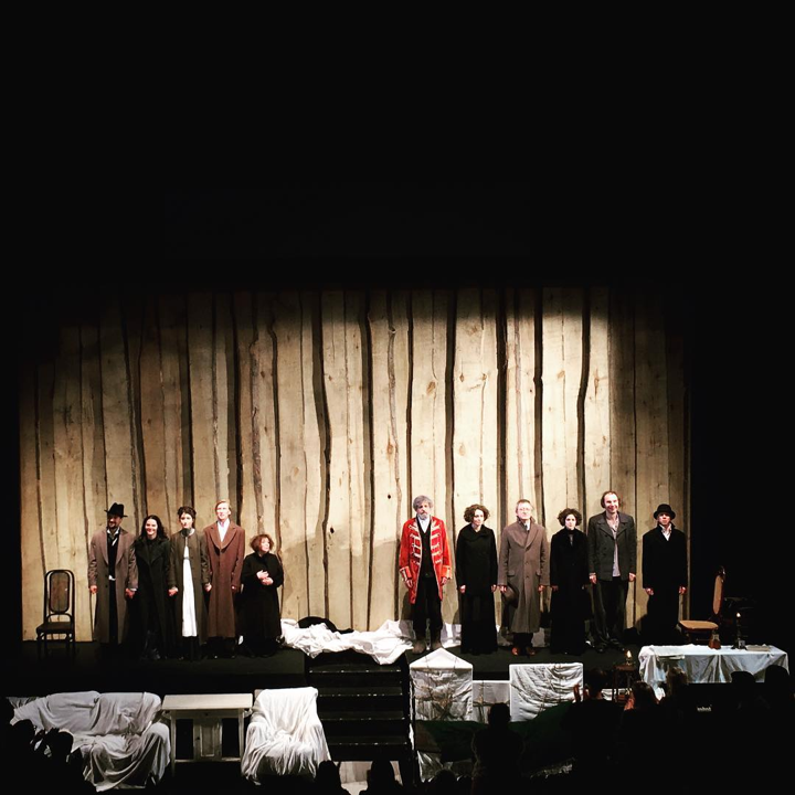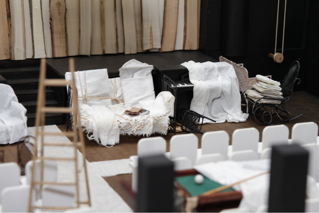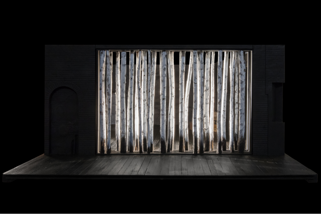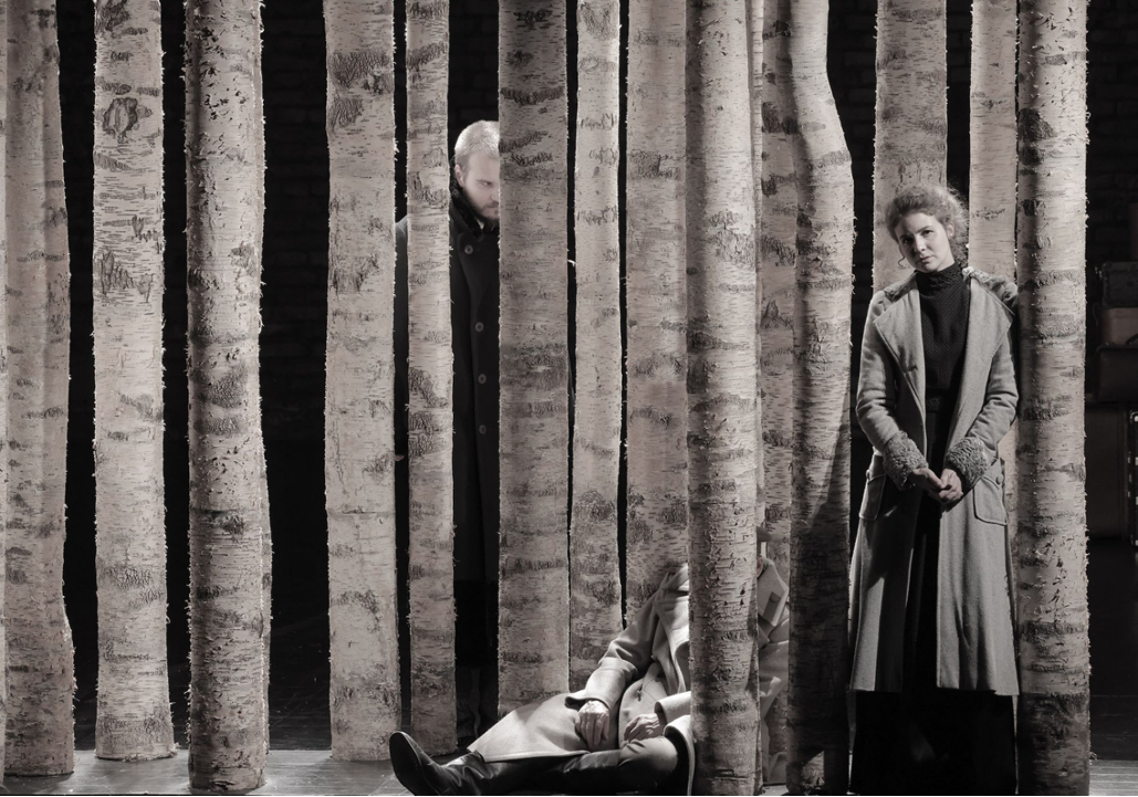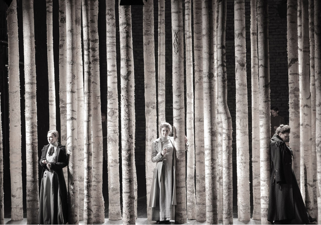 在《三姐妹》的舞台设计中,亚历山大通过极简而富有象征意味的视觉语言,深刻呼应了契诃夫原作中关于渴望、失落与精神禁锢的主题。在与导演热诺瓦奇的合作中,他将构思凝练为以“桦树林”为核心意象的舞台方案。亚历山大以多段桦树干构成密集的垂直结构,贯穿前三幕演出。这些桦树不仅把剧本里的自然意象直接搬上舞台,更成为三姐妹精神世界的空间隐喻——它们既是日常生活的围栏,也是情感压抑的象征。演员在树木间穿行表演,营造出拥挤而逼仄的生活氛围,进一步强化了角色对“莫斯科”的向往与冲破现实的张力。