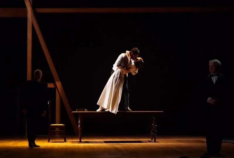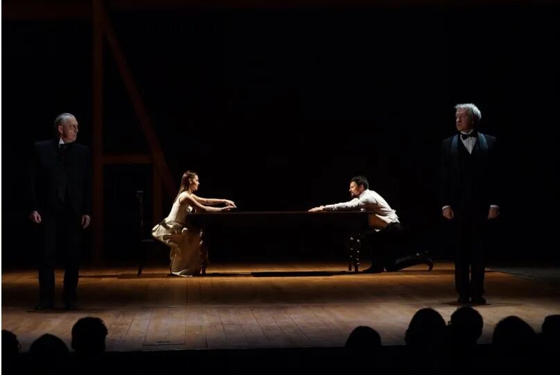 在第四幕玛莎与维尔什宁告别的关键场景中,整个桦树林布景结构通过预设的轮轨装置迅速移向一侧,舞台瞬间由“满”转“空”,形成一个突然的情感“深渊”。这一剧烈的空间转变,不仅外化了人物内心的巨大失落,也以视觉的虚无映射了希望的消逝与现实的荒芜,被评论界视为极具震撼力的舞台处理。亚历山大还曾尝试在决斗场景中引入乌鸦或是鸽子,使其飞越桦林并穿越观众厅,意图扩展戏剧空间与象征意象的层次,虽因技术限制未果,但仍体现出其在视觉叙事中追求诗意与观念融合的一贯追求。
