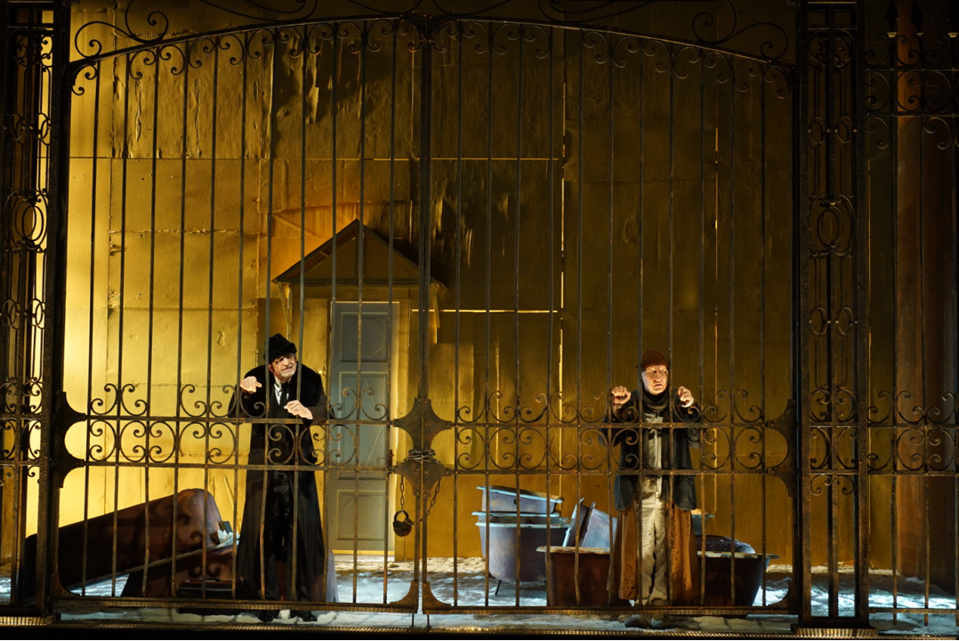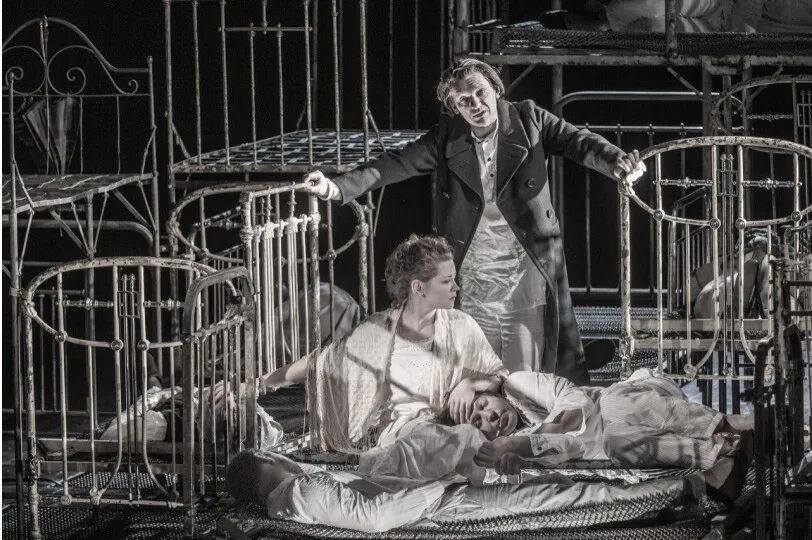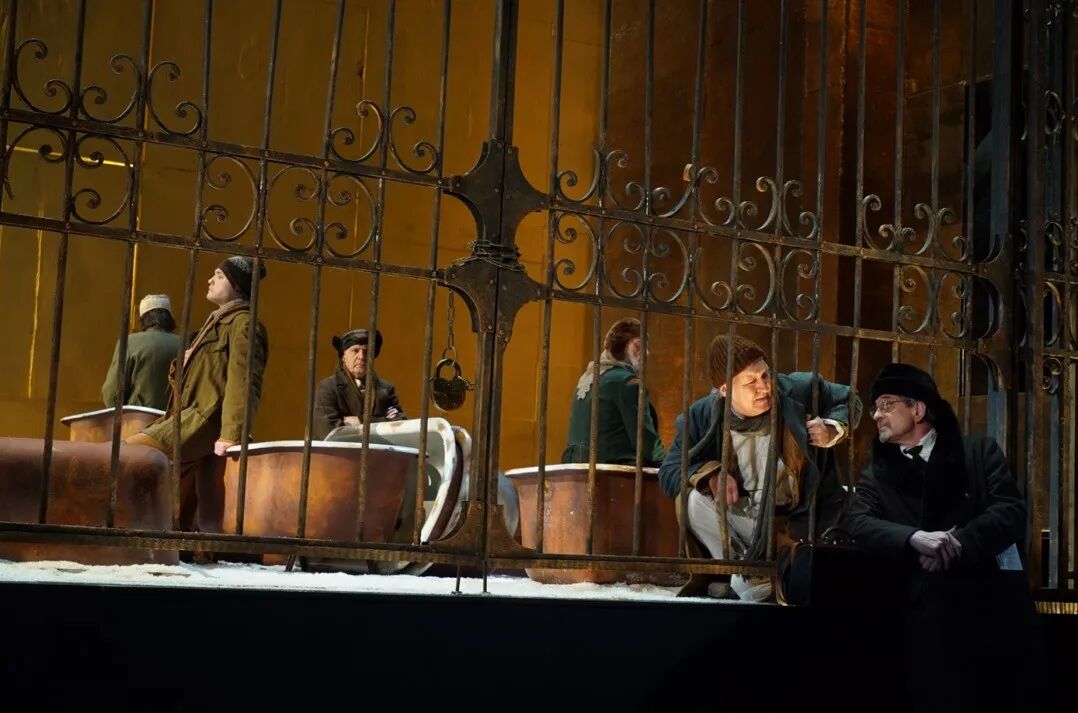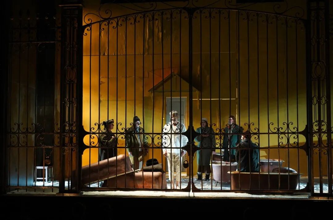 在2024年5月首演的《第六病室》中,舞台以一道巨型栅栏贯穿始终,演员被置于其后表演,形成强烈的禁锢意象。起初,这一设计引发了对表演传达效果的担忧,然而演出实践证明,栅栏并未阻碍情感传递,反而强化了文本中关于“精神囚禁”与“自由渴望”的主题。剧中庭院场景中类似棺材的视觉元素,以及角色面对敞开之门却步不前的戏剧停顿,进一步深化了存在的困境与心理的悲剧性。亚历山大刻意选用破旧板材作为后墙,通过材料本身的岁月痕迹强化空间的历史沉重感。