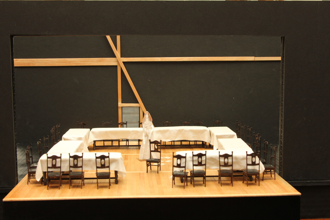 这种几乎“不著一字”的设计手法,让人想到1995 年大卫·鲍罗夫斯基在雅典迪奥尼西亚剧院设计的《樱桃园》, 它突出体现了设计师以高度剧场性的意识,对特定现实空间中创造潜力的敏感和借助:在一栋住宅楼的二楼黑色大厅里,他仅以用石灰水粉刷花园中树木的方式,将四面环绕着观众席的十四根现成黑柱子下部涂白。以惊人的简洁营造了一种木炭般的二十世纪末的樱桃园。
