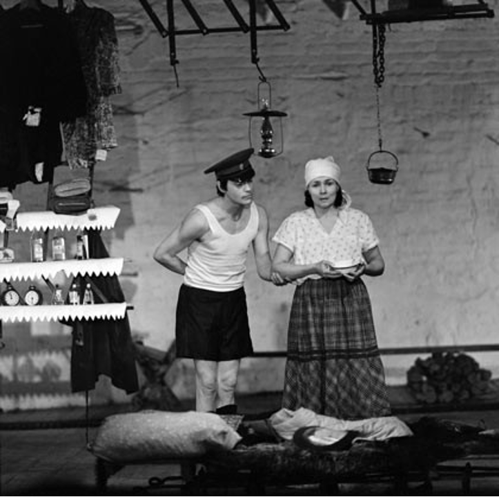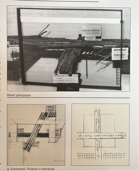 为其逝世一周年而创作的《弗拉基米尔·维索茨基》的舞台布景是六排从电影院拆下来的老旧座椅,由木框连接成一个整体,上面覆盖了一块白布。这样简单的布景,却能变化呈现出特别多的场景,如战场、监狱、电影院、车站、公寓楼。为何选择电影院的座椅,是因为剧目开始的时候,演员们进来坐在座椅上看维索茨基的妻子演的电影。