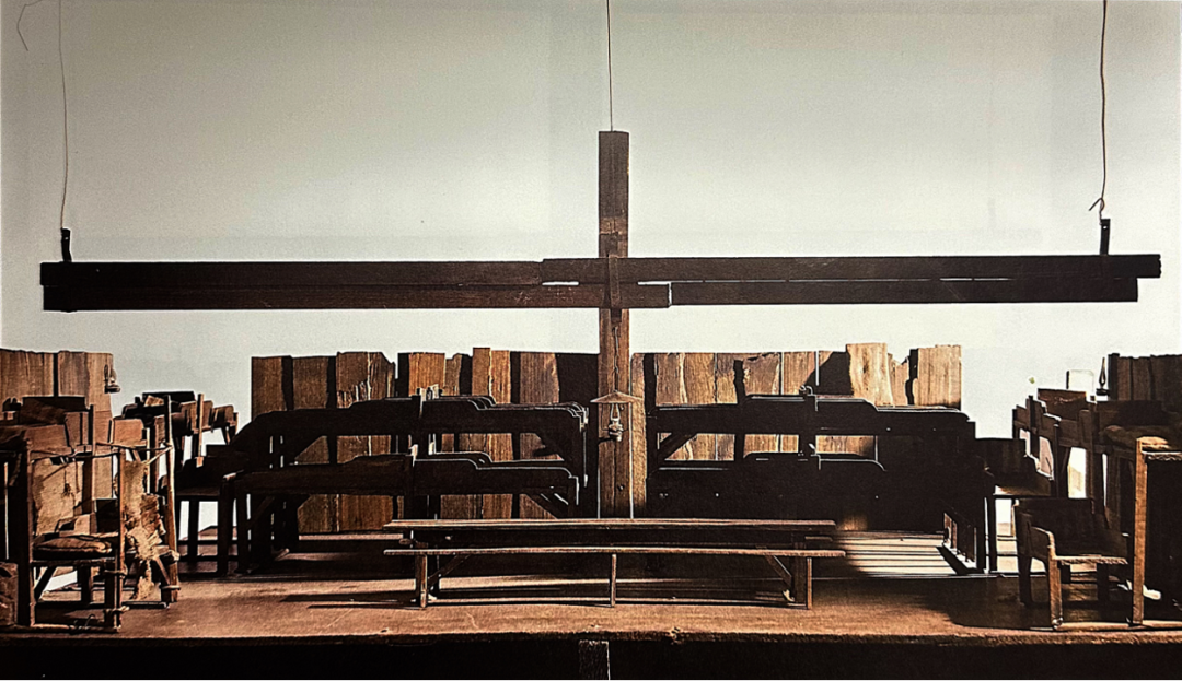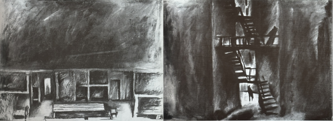 这个舞台主要用到了一排排的木质座椅,演员可以在上面进行群像演出,也可以只留一个人,进行独白。因为作品是关于哲学探讨的主题,我们应该选择什么样的道路?我们应该怎么办?所以木板上画了很多哲人的头像。