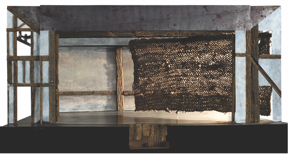 对于舞美设计来说,经常会发现之前构思的某个东西会更适合另外一个地方。比如我母亲编织的这块网布,我父亲就突然觉得更适合放到《哈姆雷特》的舞台上,并且成为一个非常重要的元素。这个网布的装置可以前后左右移动,甚至还能够360度旋转,它可以到达舞台上的任何位置。