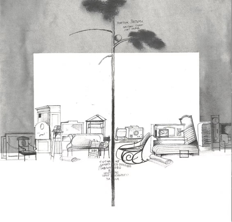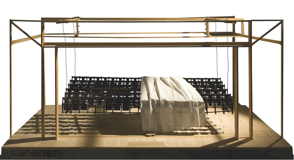 我的父亲有一次走进塔甘卡剧院观众厅时,里面的检票员正慢慢地拉掉一块遮盖观众席的布,露出下面的一排排座椅,这突然让他想起雪花在大地上融化的样子。由此就诞生了《弗拉基米尔·维索茨基》的舞台设计。