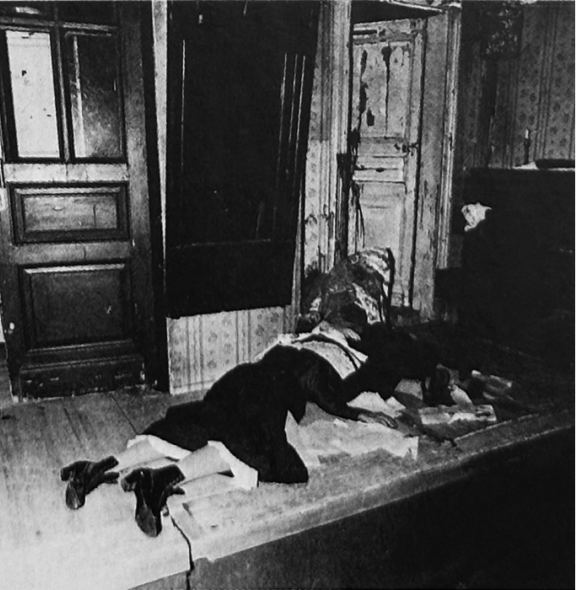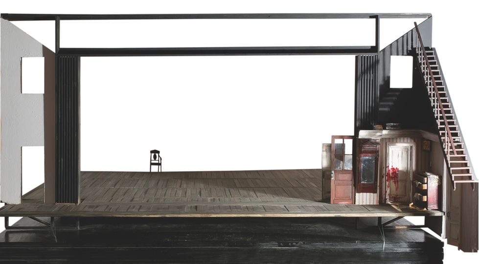 整体舞台做了假定性处理,但是只有舞台台口右侧做了写实处理,这里还原了在一间公寓里的凶杀案现场,有两具遇害的女尸、门上有血液流下的痕迹……因为这个场景的位置,入场观众会停下来观看,甚至一度引起了入场拥堵。舞台上公寓的布景,比如门窗等是实际收集来的,而不是特别制作的。父亲在空间设计上有一个非常特别的方法,就是把真实的事物与假定的空间进行结合与对比。