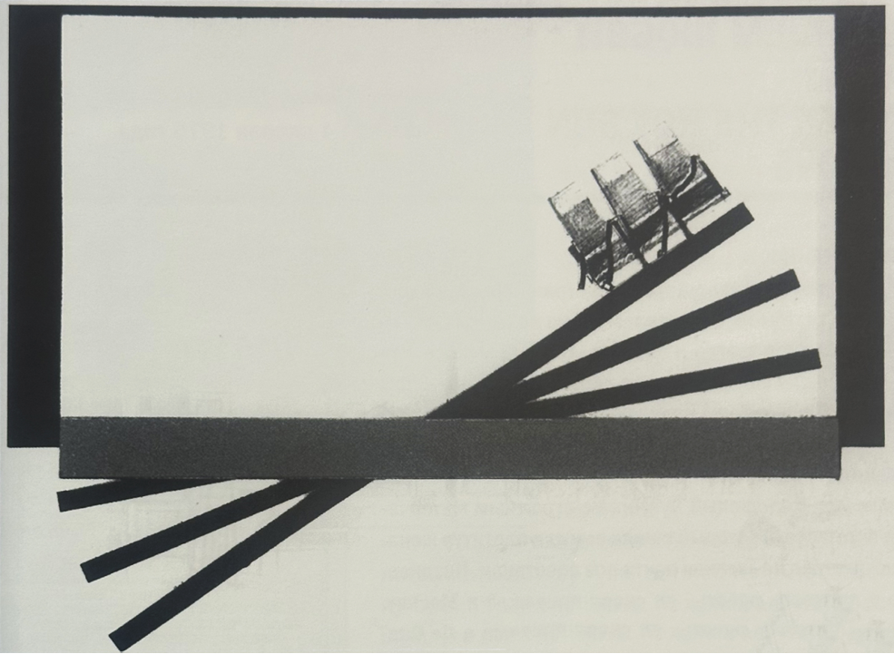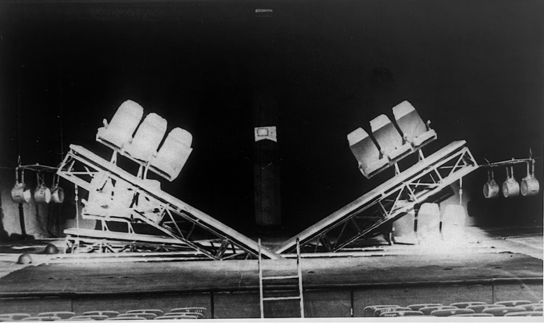 上面的构图也非常有意思,舞台上有一堆家具,每件家具上还贴着小广告。有一棵松树是设置在观众席的走道里。
