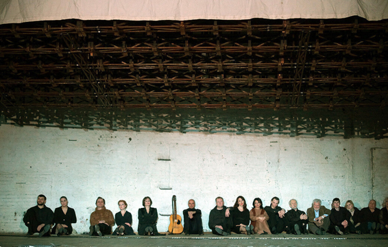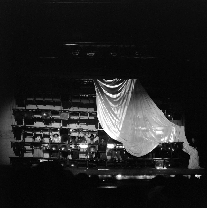最开始白布是完全覆盖住座椅的,像一个巨大的灵柩,演员站成一排站在周围,像是给主人公送葬。结尾的时候,白布和座椅都会慢慢地升上空中,一直升到看不见的地方。