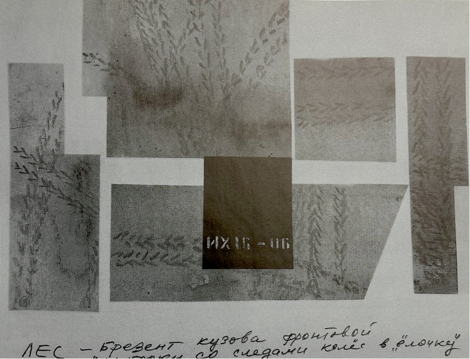 上面这张图是卡车的轮子刷上沥青色以后,碾过画布留下的痕迹,卡车轮子的纹理好像圣诞树的纸条形象。这样的图案是被用来代替松树林的感觉。