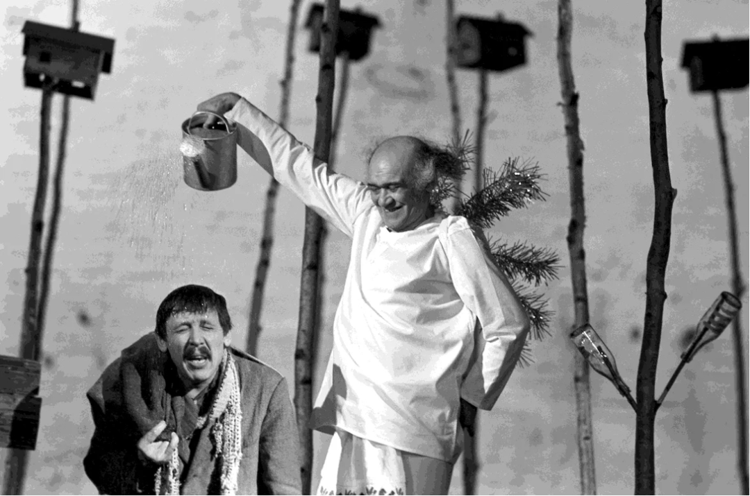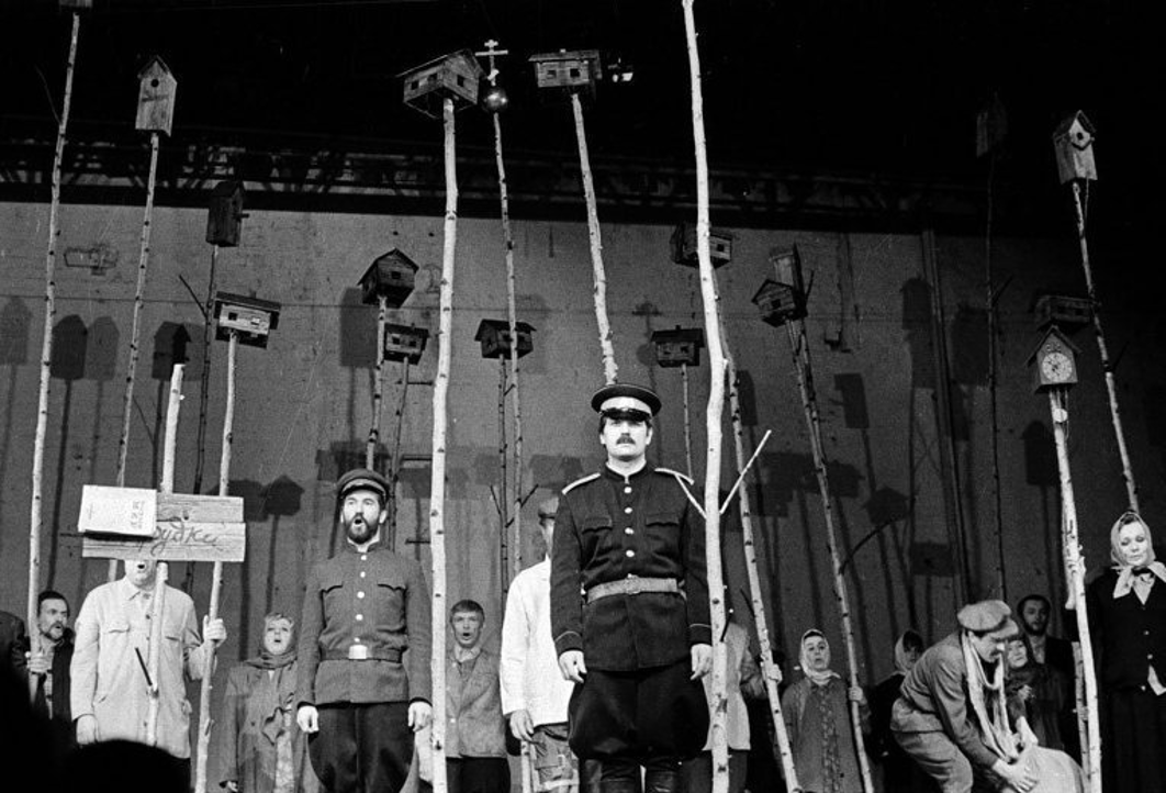 舞台上的演员拿着桦树的树干,树干的顶端有钟表、教堂的圆顶、布谷鸟栖息的树屋,象征着俄罗斯自然景观的场景。这些树干会随着剧情发展做相应的动作,比如在暴风雨的晚上,演员会手持树干来回摇晃;当威胁一个人的时候,有的演员会把树干对着他,像要捅他一样;当表现法庭的时候,会把树干会拦在演员前面,当法庭的栏杆。
