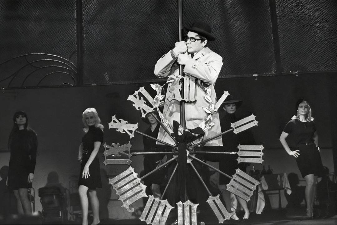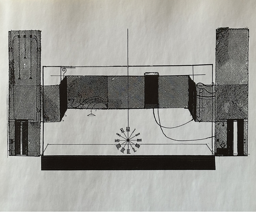舞台中间是一个特别大的钟表,它可以来回晃动,来表达时间的流逝。3和9这两个数字可以转成水平,演员就可以坐在这两个数字上,进行聊天,随着钟表晃来晃去。
