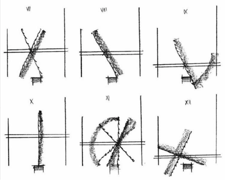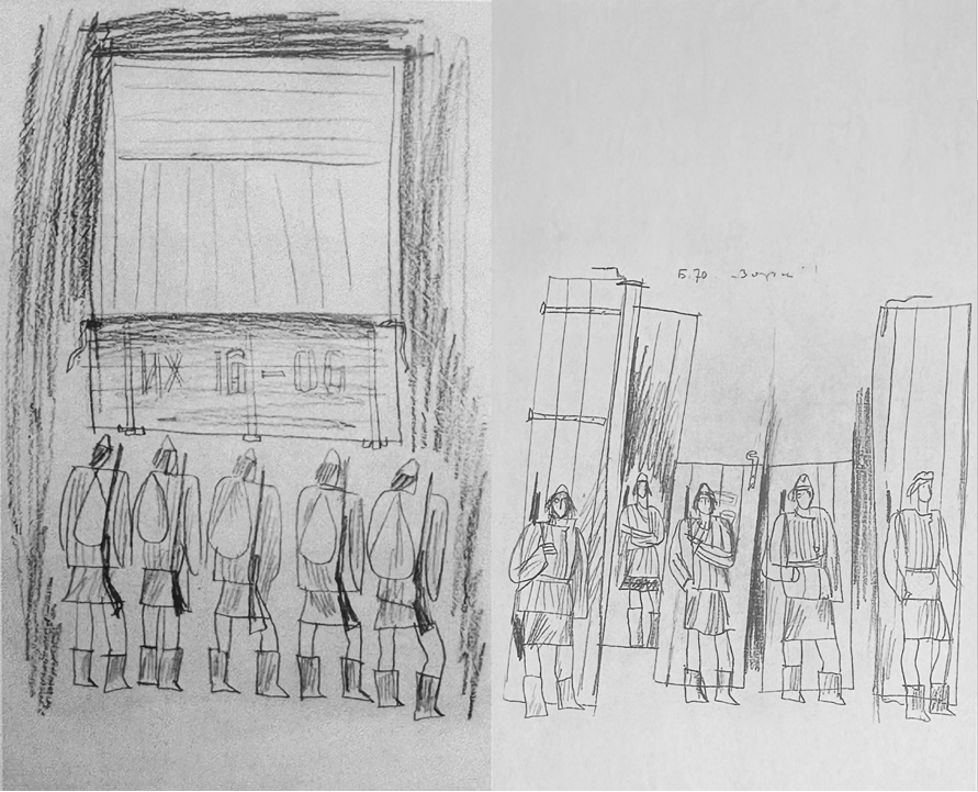 在右侧的图里面,大家能看到士兵也与他们一起坐着列车去前线的。从这些手稿图里也可以看出,他的绘画笔法,跟二三十年代俄罗斯先锋派艺术家的画法有很多类似的地方。
