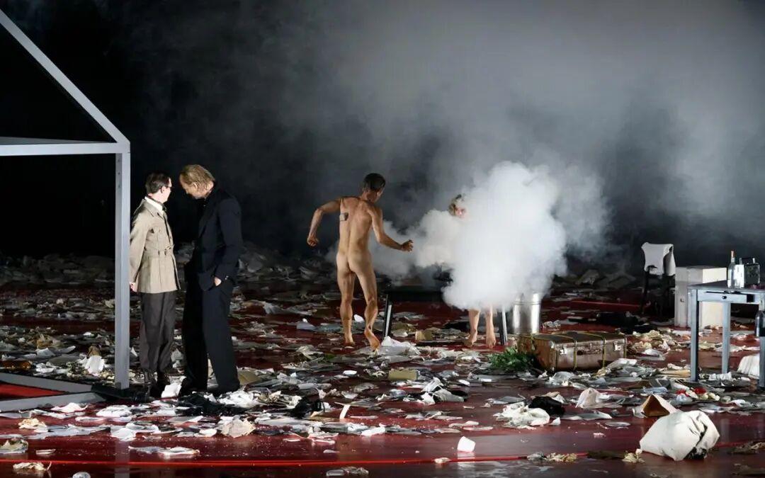 在20世纪初欧洲的戏剧作品中,艺术家们不遗余力地尝试用演员的赤身裸体把人“赤裸的肉身”释放出来。回到舒茨的《麦克白》(2005),正是由于在这部戏中观众得以“看清”原罪,这项原罪的重量直指观众,产生了常规观演方向下反方向的抗拒,这无异于从舞台上架了一台照向观众席的面光灯,打在所有人赤裸的脸上,驱散那些应有的暴力,让肉身出场。舒茨的众多作品都赐予演员以无花果树叶,他建造这座失乐园,将舞台上赤身裸体的演员回归到自然的隐秘的人类身体,让观众投以坦然地凝视。