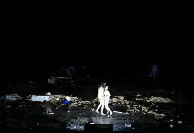 在《麦克白》(2005)中,我们看到当雄心的纸张被撕毁时,野心的碎片遍布,构成无法重归于好的混乱。舞台上深深的漆黑模糊了后场形象的边界,好像他们正在沉入黑暗,或正在从黑暗中浮起。形象赤裸的肉身,在这部戏里呈现出衣装丢失的趋势,而非衣装的尚未出现,这份丢失好像让观众吃下失乐园的禁果,渐渐看清人类的原罪,又流转到人类坚持保留到最后的诙谐的皇冠。