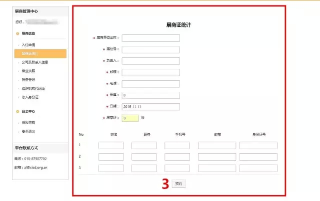 完成会员注册、登录后,点击“展商证统计”。请准确、完整填写各项信息后,点击“预约”确认。