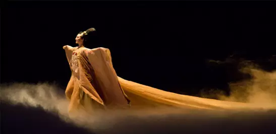 2.“妃”的部分,化为二只巨大的“拱手状”官服袖口,中间垂下的线绦与灯光配合,成为杨贵妃上下场、与前朝后宫的连接点▽▽▽