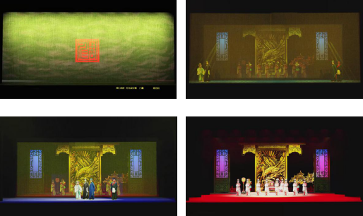 此次西安秦腔剧院有限责任公司领导班子特意对《周仁回府》该剧目进行了再次的加工提升,在舞美灯光方面进行了重新的包装。我有幸与中国戏曲学院教授马路老师共同担任本剧目的灯光设计; 在本剧目设计初期再次使用wysiwyg灯光设计软件对该剧目进行前期设计效果创作,以易俗大剧院为基准尺寸进行3D建模,分布灯位和舞美,预演各个场景之间的转换,和每个场景的灯光效果变换演示,进行离线编程;前期利用软件虚拟现实灯具以及灯具的吊装位置,通过网络与控台连接,使用控台对软件中的灯具设备进行控制,虚拟现场演出环境,反复与主设计马路老师通过网络进行设计方案的沟通与交流,进行灯光效果编程设计工作。以达到提前了解灯光设备的特性,“预览”舞台演出现场灯光效果,利用软件直观的灯光展示方式,提高现场编程工作的效率。