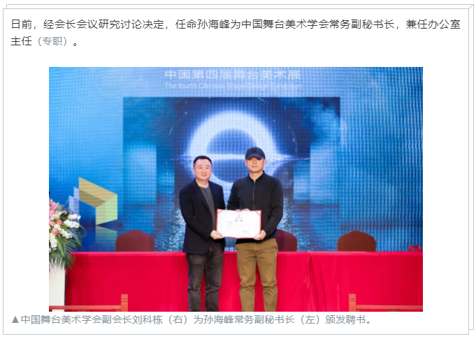 孙海峰被任命为中国舞台美术学会常务副秘书长