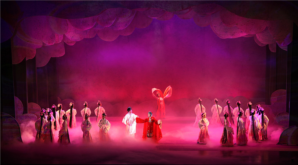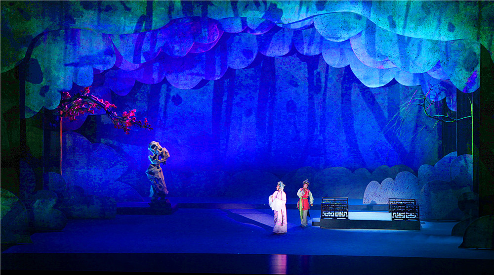 以牡丹花卉形态为基本舞台形象元素,表现似真似幻的梦境世界,水墨笔触和花卉投影形象和道具点缀,表现故事从书斋、庭院、花园、卧室、地府等场景空间转换。多媒体影像与现场演员互动。