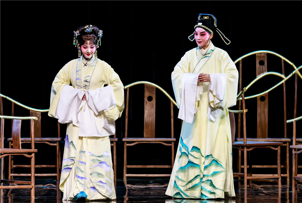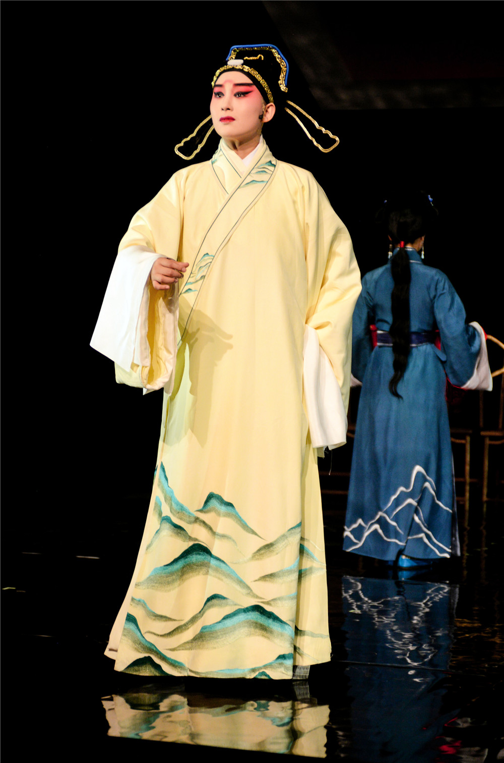 在设计中用流畅隽美的江山线条、清新雅致的色彩、统一的艺术形象,来塑造剧中人物形象,带给人一种独特的审美体验。舞台上椅子(椅背)的造型也有《千里江山图》元素的呈现,连起来的椅背看起来如延绵起伏的江山,配合演员戏服上起伏的山脉,《千里江山图》理念由此贯穿整个舞台。