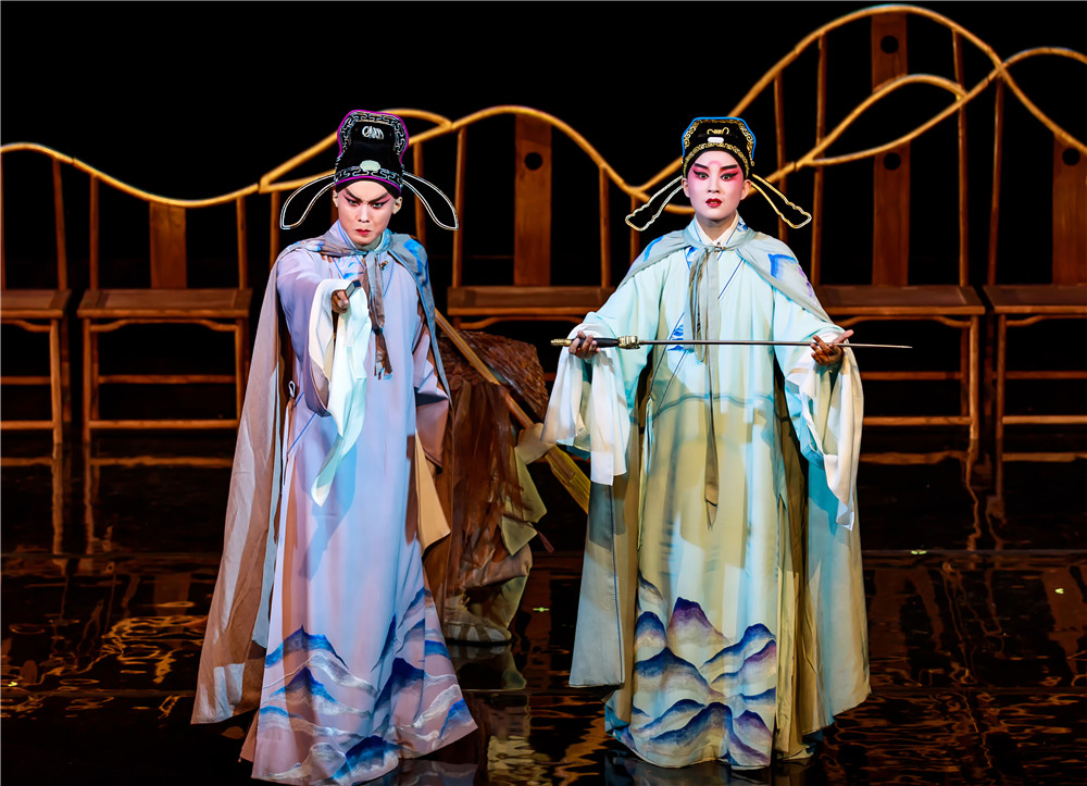 In the work, the fluent and powerful lines, fresh and elegant colors and unified artistic images are used to shape the characters’ images which bring the audience a unique aesthetic experience. Furthermore, the shape of chairs are also designed to present the elements of the gorgeous map, which makes the scene on the stage like a rolling river and mountain together with shapes on the performers’clothes.