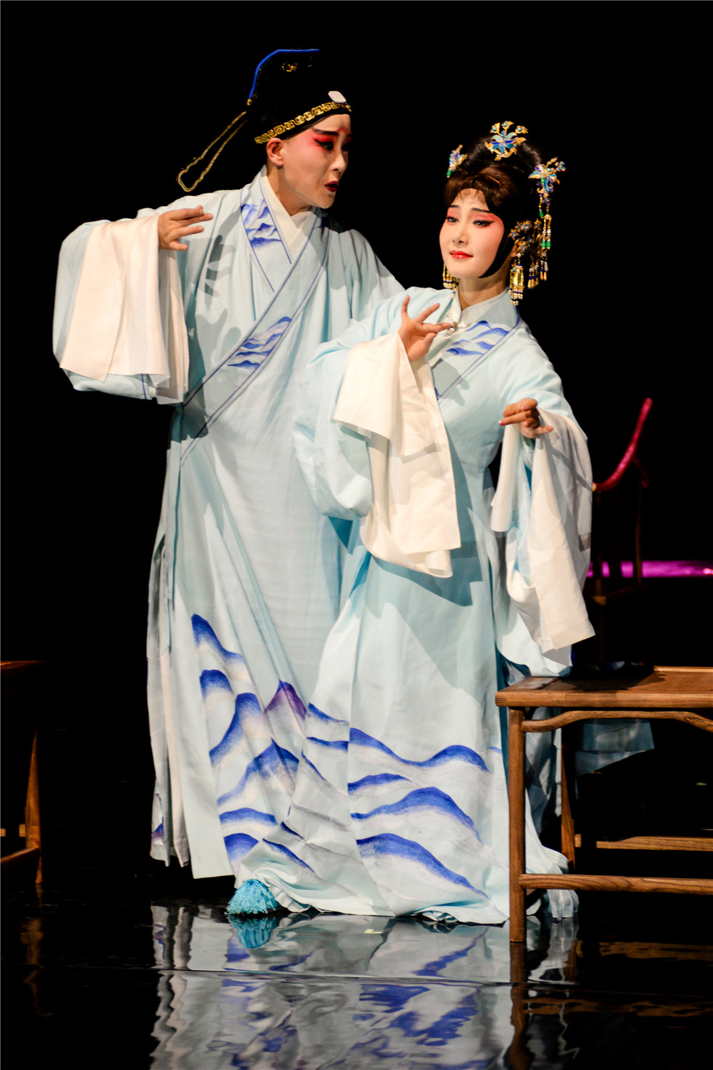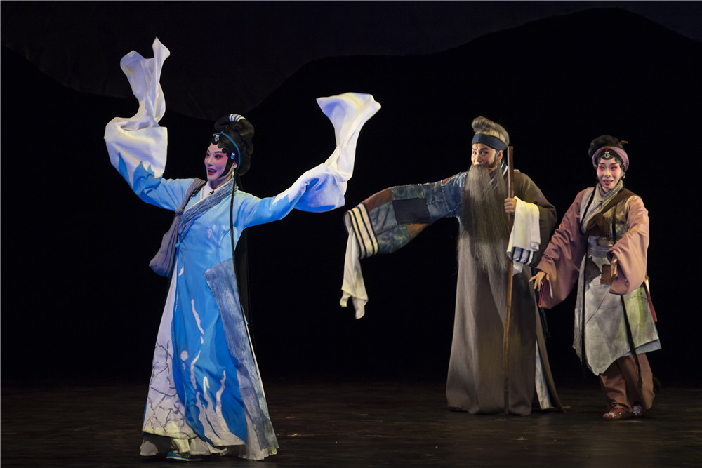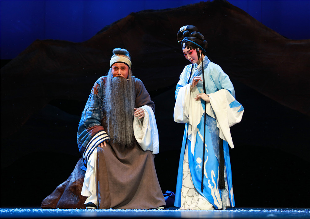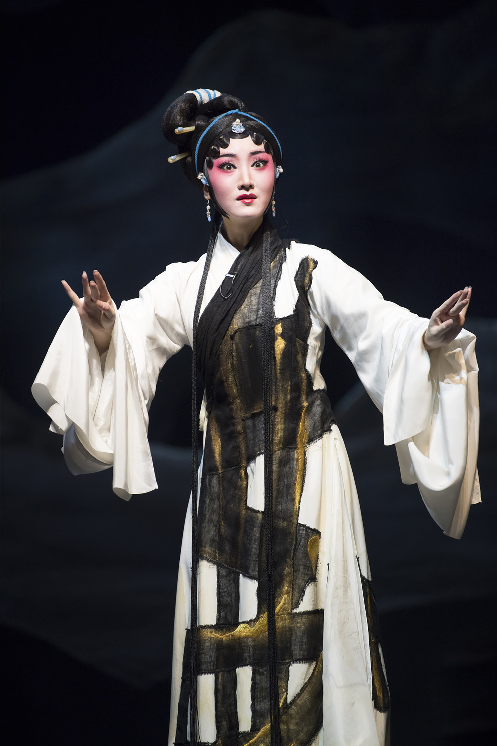 The designing of the costumes is full of details and echoing the plot. In the scene of Meng Jiangnv is crying at the foot of the Great Wall, her white cloth made of crepe-back stain is pasted with a thin black summer cloth that has been dyed appropriately and with good light transmittance. The effect of shaping texture of the fabric is very ideal.