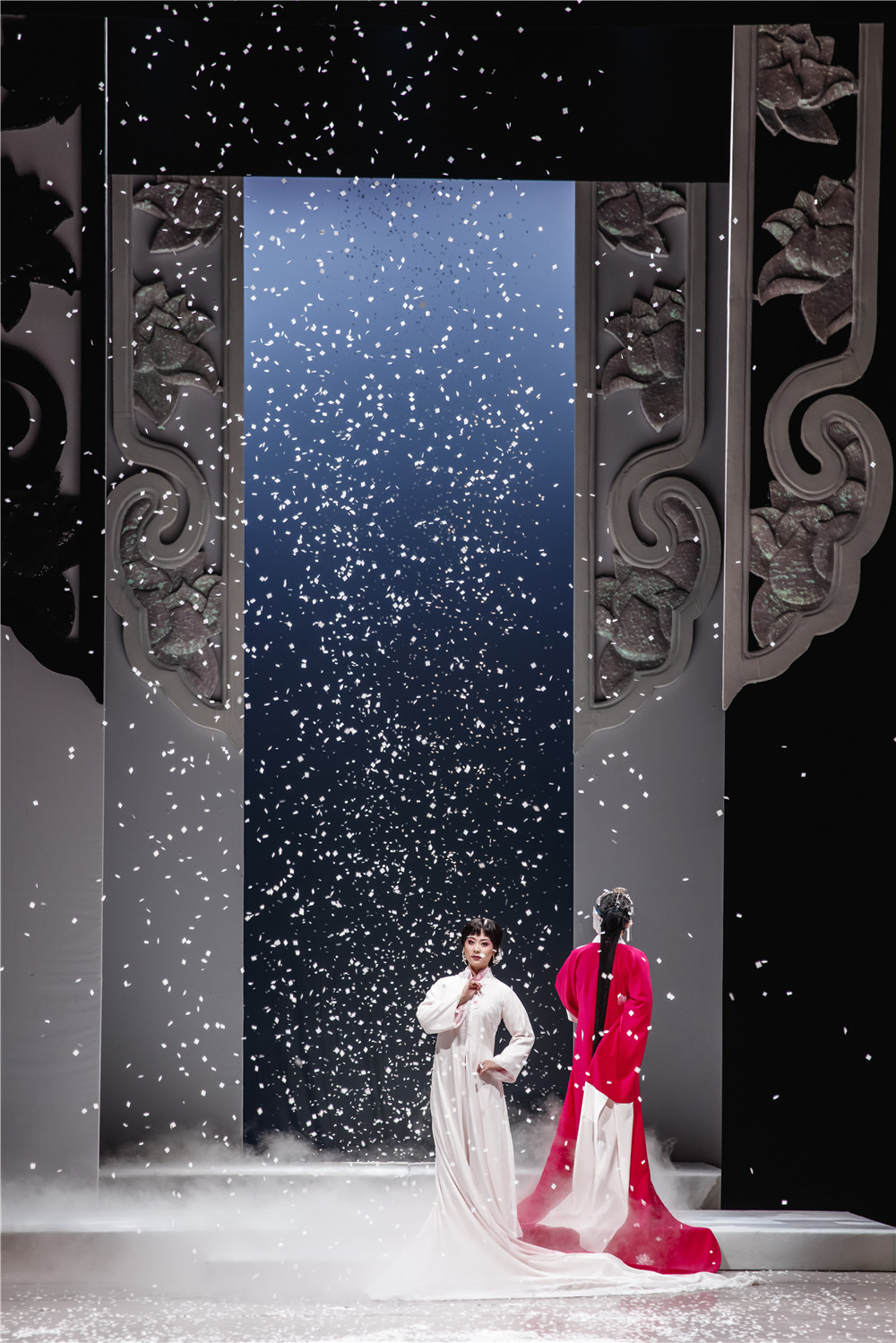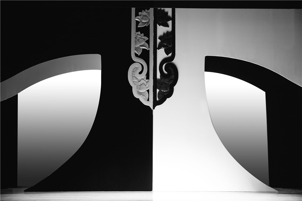 2018年 江苏省苏州昆剧院民国时期名伶魏莲生和权贵宠妾玉春之间的悲情爱恋。他们邂逅相识、真诚相爱。二人希望拥有属于自己的人生,决定出走。事败后,魏莲生被驱逐出境,玉春被转送他人。20年后,两人归来当年定情处,未及晤面,魏莲生死于风雪之中,玉春则不知所往。用当代的视觉表达完成现代与古典的融合,在中国古老的剧种昆曲中做现代审美的舞台设计。二人因戏结缘,莲生送珍爱的戏服给玉春,如同送她所有的爱慕和思恋。从戏曲服装中受启发,用戏服衣领的形象做斜边的纱质墙面,黑白前后两道,抽取戏曲水袖的意象形成后区三道肌理纱幕,可以上下升降完成不同场次的情绪渲染变化。在戏的结尾,用放大的戏服形象做三层开合处理,黑白相间,一层层打开,让两个相爱却没能在一起的人,在另一个世界相见。放大的戏服放大了他们的信物与承诺,也放大了他们因戏结情的爱恋。