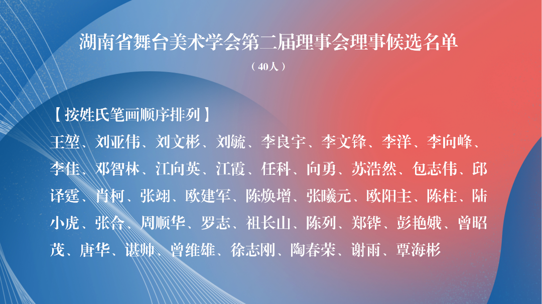 湖南省舞台美术学会第二届第一次理事会会长、副会长、秘书长候选人名单及产生情况说明(摘要)