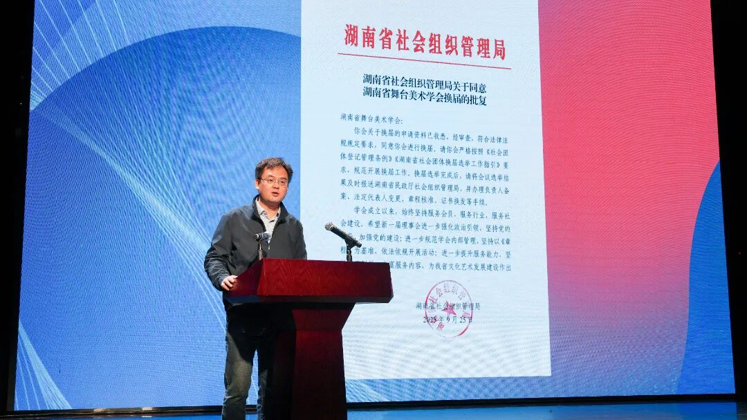 2025年9月27日,湖南省舞台美术学会第二次会员代表大会暨换届大会在长沙湖南大剧院四楼小剧场隆重举行。此次会议由湖南省舞台美术学会副会长兼秘书长祖长山主持,出席成员包括主管部门领导、相关单位领导、中国舞台美术学会领导、湖南省舞台美术学会领导、理事和来自全省的会员代表、舞美企业代表等。