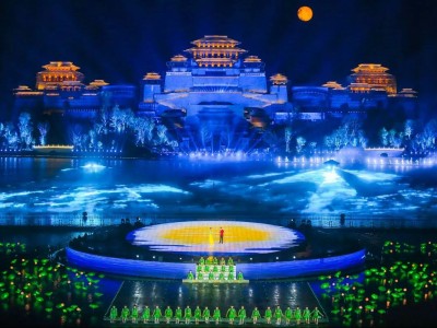 七岛环抱的汉源湖水域宽阔,周边环境优美,以汉文化博览园、汉乐府、兴汉城市展览馆为主体背景,作为整体观众席的汉金台可容纳4000人观看。纵横开阔的景深与面宽,形成了一个前所未有的全景式晚会演出环境。