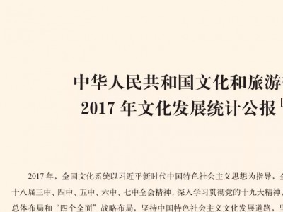 为进一步向国内外全面客观展示我国文化发展改革成就,充分发挥统计数据客观性、简洁性、权威性特点,自2014年起,文化部连续四年发布了统计公报,取得了很好的舆论反响和社会效果。近日,《中华人民共和国文化和旅游部2017年文化发展统计公报》(以下简称《公报》)正式发行。