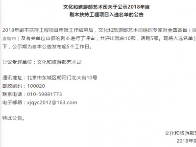 2018年剧本扶持工程项目申报工作结束后,文化和旅游部艺术司组织专家对全国各省(自治区、直辖市)及有关单位申报的剧本进行了评审,共评出戏曲10部,话剧5部。现将入选名单公示如下,公示期为自本公告发布起5个工作日。