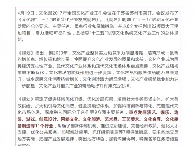 4月19日,文化部2017年全国文化产业工作会议在江苏省苏州市召开。会议发布了《文化部“十三五”时期文化产业发展规划》。