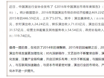 近日,中国演出行业协会发布了《2016年中国演出市场年度报告》(以下简称《报告》)。