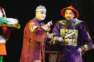 随着音乐的间奏,面幕灯光逐渐改变着它的颜色,由黄加红变为蓝,而中间图案更变为紫,随着变化,从幕的背后几束黄光把“奉旨钦差”打穿,呈现在观众眼前的是“无旨钦差”,一个字的变化顿时给观众眼前一亮的感觉,同时也点出主题,使观众在享受的同时受到协调的视觉冲击。