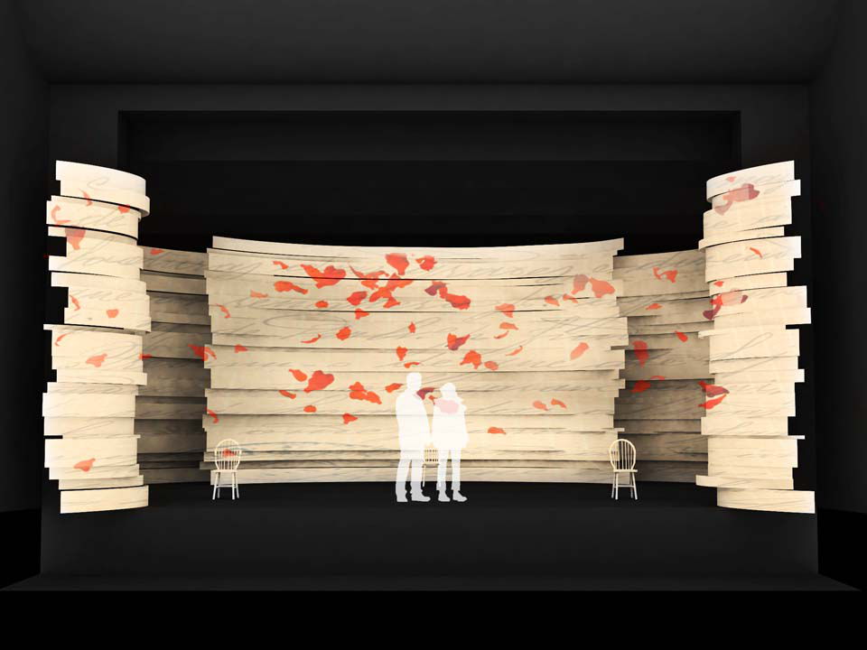 这一方案去掉了大部分的装饰,只保留必要的投影界面以及最基本的纸的造型,并在舞台后区增加了一组平台和两条坡道,为演员与多媒体之间的互动提供了必要的空间支持。此外,为了与纸的主体形象相呼应,台口上沿挡片也设计成了多层次的曲线薄片造型。