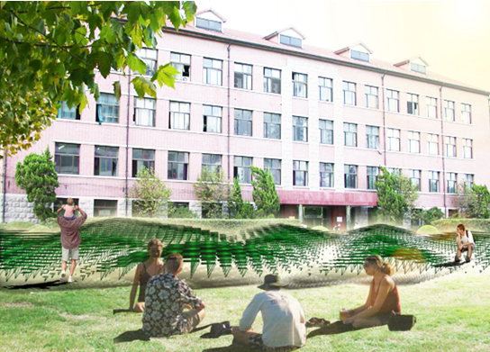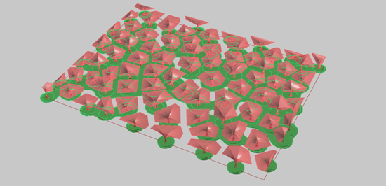 可以试想在学校草坪上做一个空间设计。我们可以根据人群在草坪上运动的数据,把人群逗留处的位置作为中心来建造空间(图9),或者以人群通过草坪的流线来控制场地景观(图10)。而最重要的一点是,当逗留位置与人群流线改变时,空间便会自动更新。也就是说,这完全是一个活的设计。