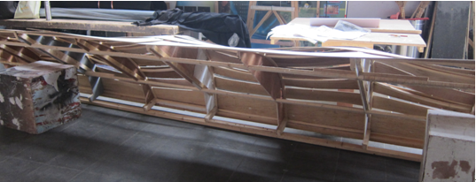 在实际布景制作过程中,由于预算的限制,参数化部分也采用了人工制作。不过,得益于前期详尽的案头工作,具体的制作过程进行得非常顺利。制作人员按照网格放样的原理,先将曲面结构骨架成功地制作出来,然后再借助在骨架上方搭接薄木片来实现曲面的起伏造型(图14)。同时,还通过在表面包裹地毯和黑棉布,使曲面的过渡显得更加自然,从而完全实现了最初的设计意图。
