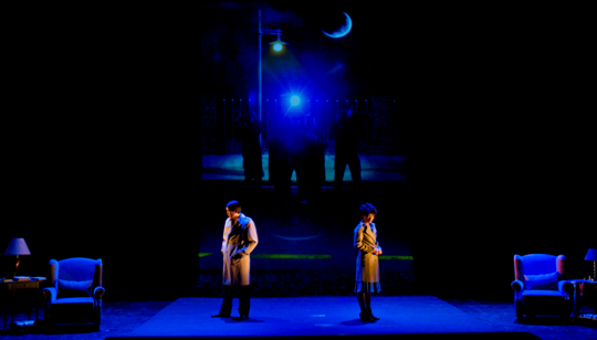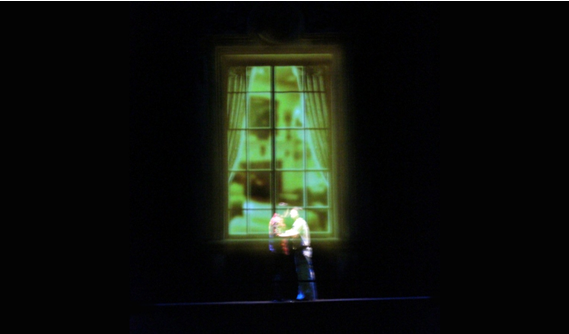 终于,男女主人公在漫长的分别后有了一次单独相处的机会。这个私密的旅馆空间被安排在黑幕的背后,它通过在黑幕前投射窗户的影像,实现了多层次的舞台空间。
