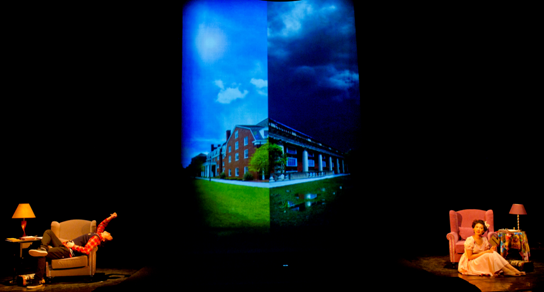 剧中,两位少年时代结下纯真友情的主人公,后来分别被送到不同的城市上学,因而只能通过书信来传递彼此的情感。这时,背景影像表现为分裂的两部分,恰好呼应了前演区两盏成像灯点亮的演员表演。(图16)