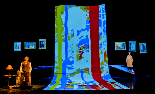 此时,在舞台后区设置了额外的六块投影板,意在通过在上面投影画作营造出画廊之境。