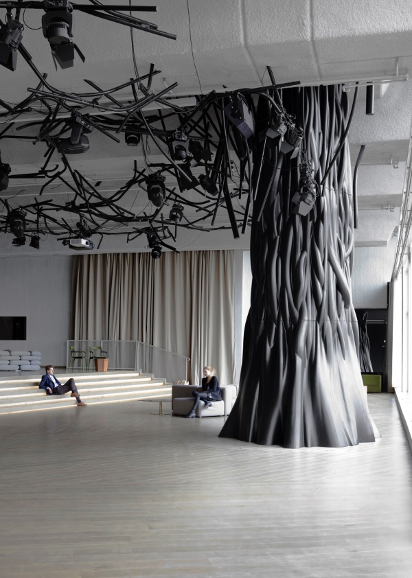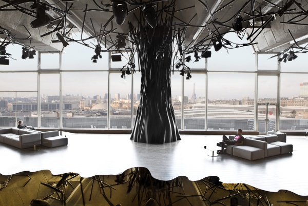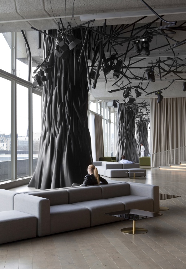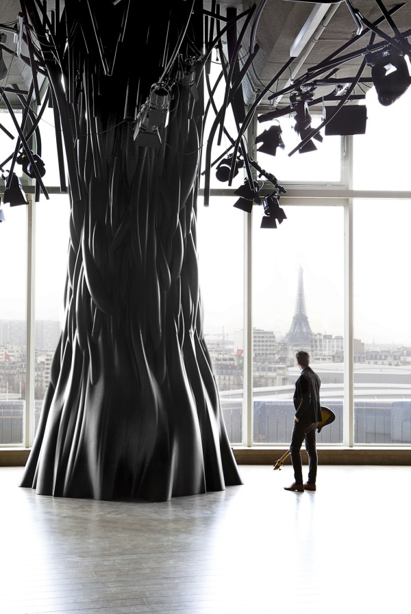 法国设计师Mathieu Lehanneur在巴黎一个面积超过1000平米的阁楼上设计了一个树冠之间的悬浮天地—Electric场馆。巨大的电线交织成细黑的树木。