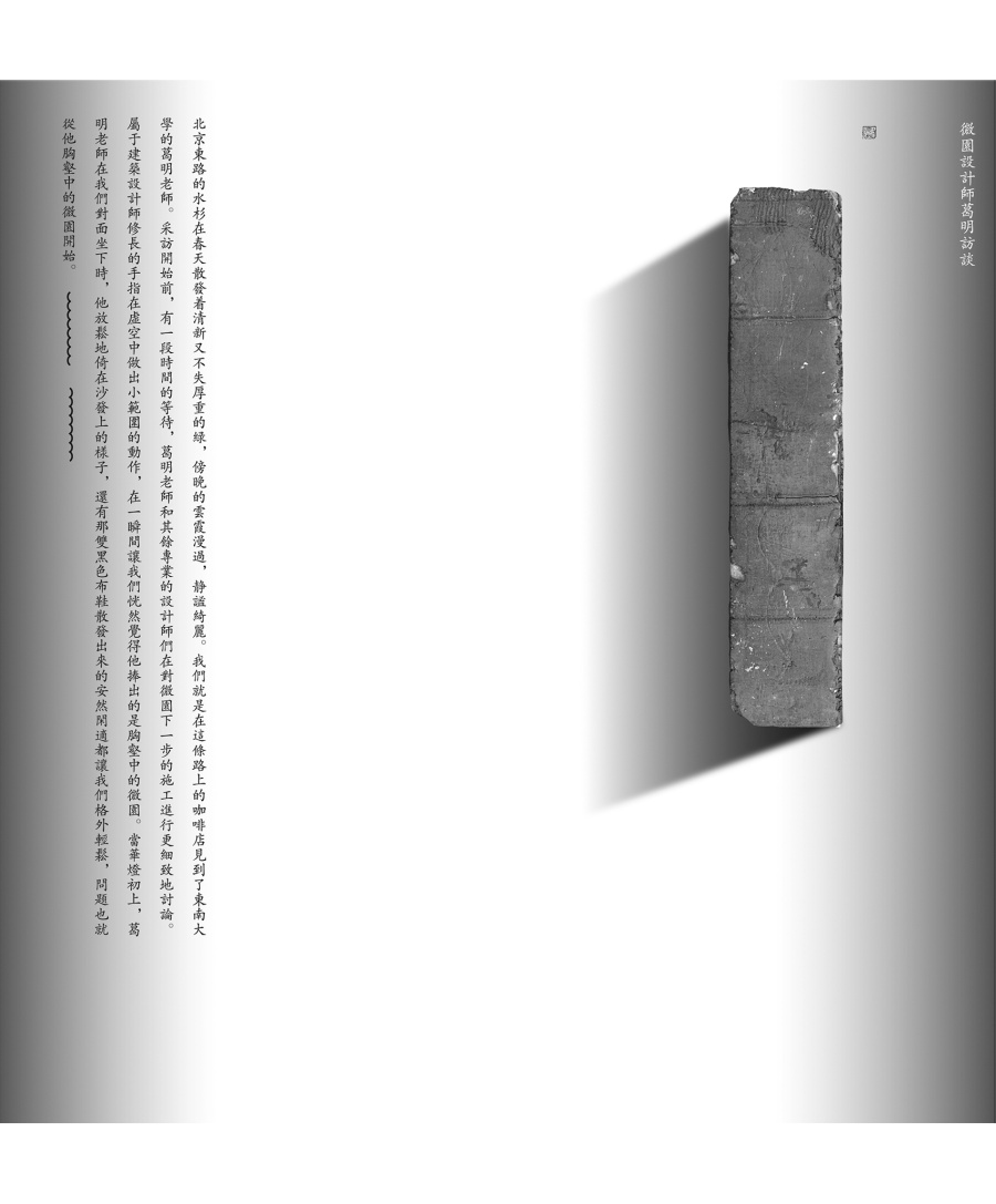 书册没有特别强调丰富的园林景观,更多的是强调微园的气息、质地和流淌的时光,尽最大努力让读者忘掉书册的设计而记住微园,这或许就是葛明老师所说的余光吧。